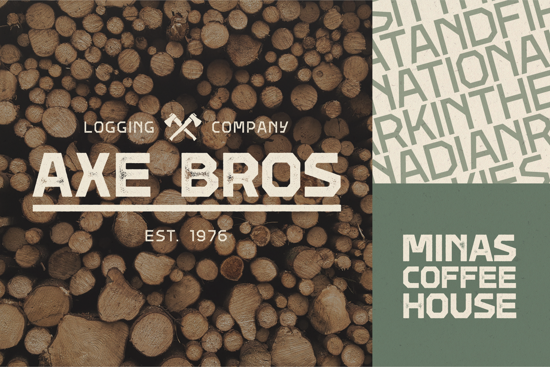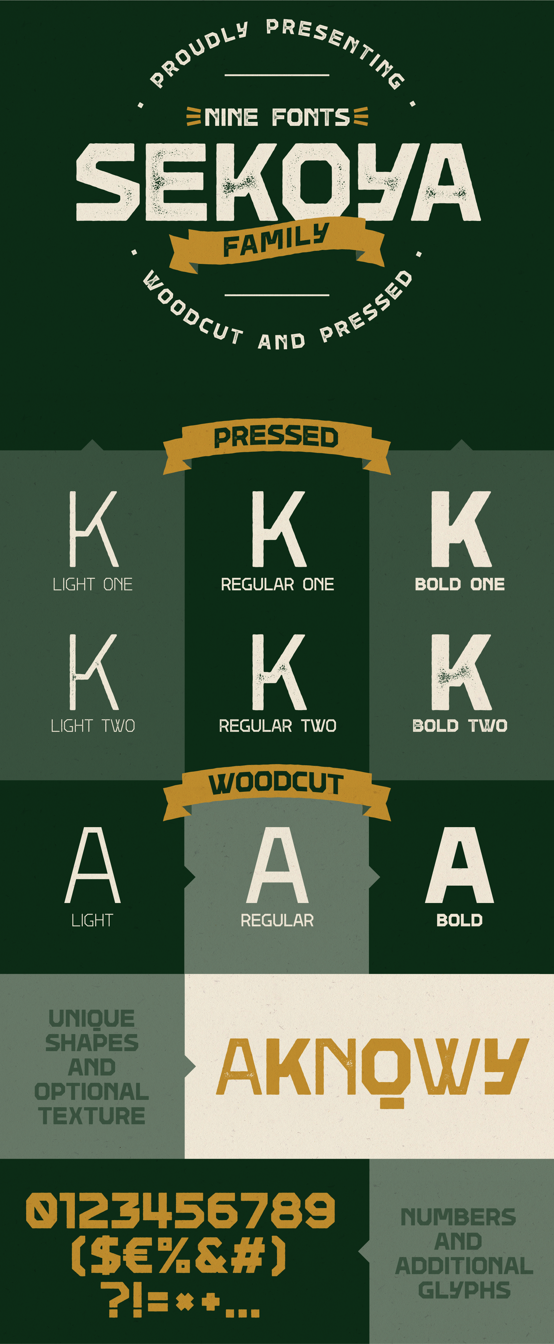 Sekoya is a font family inspired by handcrafted wood letters and wood stamps. Woodcut is the clean and straight version of Sekoya. The Pressed font has a vintage stamp effect with optional texture. The family comes with light, regular and bold.